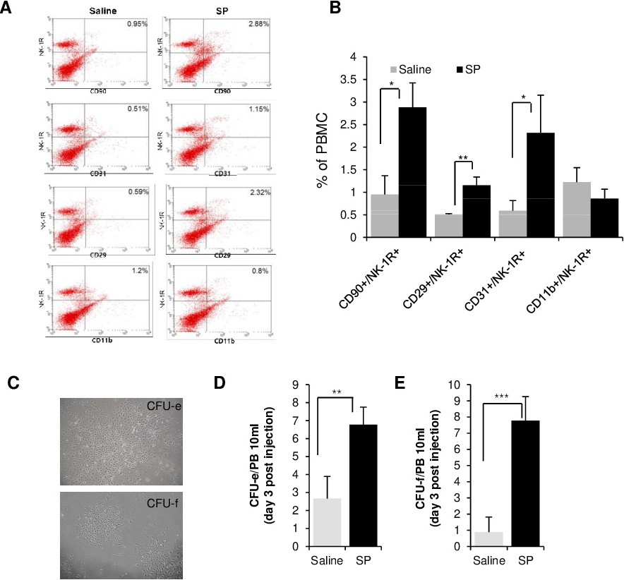 Recently, SP was found to stimulate mobilization of reparative stem cells into the blood circulation, leading to tissue repair. The cell mobilizing capacity of SP prompted us to explore its role in cardiac protection and recovery from AMI. First, we examined the capacity of SP to mobilize neurokinin receptor 1 (NK1R+) EPCs and BMSCs in non-injured normal rats by fluorescence activated cell sorting (FACS) analysis on day 3 post-SP injection (Fig. 1A and B). SP injection elevated NK-1R+ cells in the PB, and this population included CD29+, CD90+, and CD31+ cells. NK-1R+ cells from the PB were cultured in endothelial cell growth medium (EGM) or mesenchymal stem cell growth medium (MSCGM), respectively, and colony forming efficiency was evaluated (Fig. 1C-E). SP increased the colony- forming stem cell population in the circulation, compared with that observed in the saline-treated group.