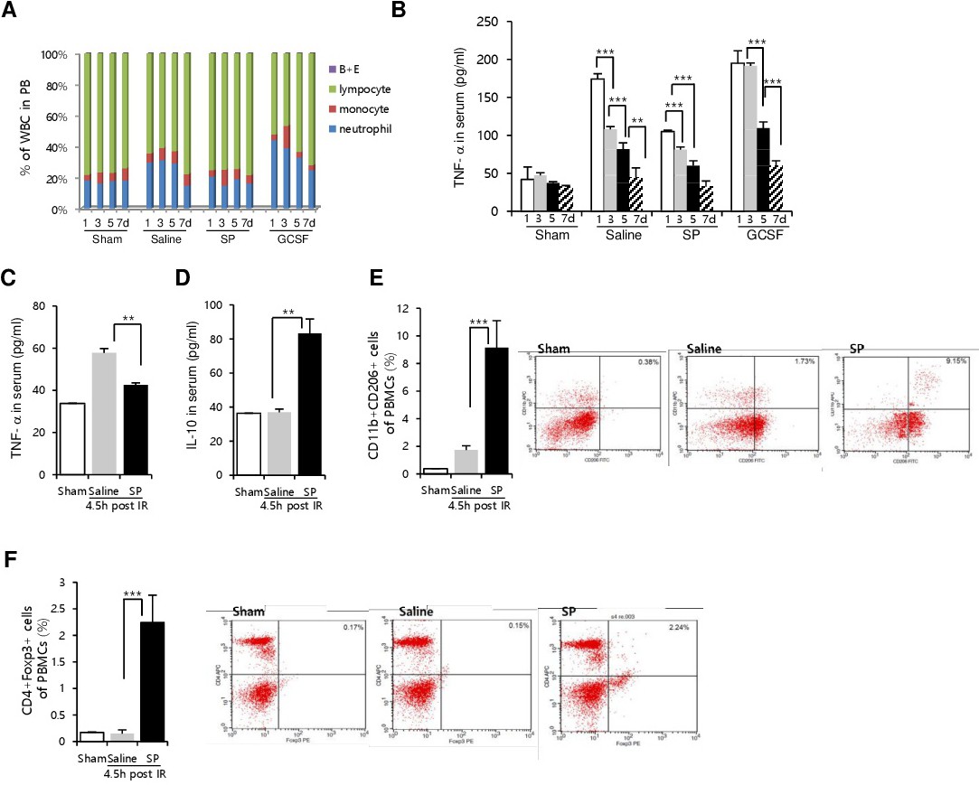 Regarding IRI-induced systemic inflammatory responses, IRI itself increased the neutrophil ratio in total leukocytes up to day 5 (Fig. 3A) and increased TNF-α in the serum on day 1 post-IRI (Fig. 3B), corresponding to an injury-mediated inflammatory response, which regressed from day 3 post-IRI. This systemic IRI-mediated increase in TNF-α production was abrogated by SP injection but was further extended up to day 3 by GCSF injection. Clearly, GCSF increased the inflammation burden after IRI.