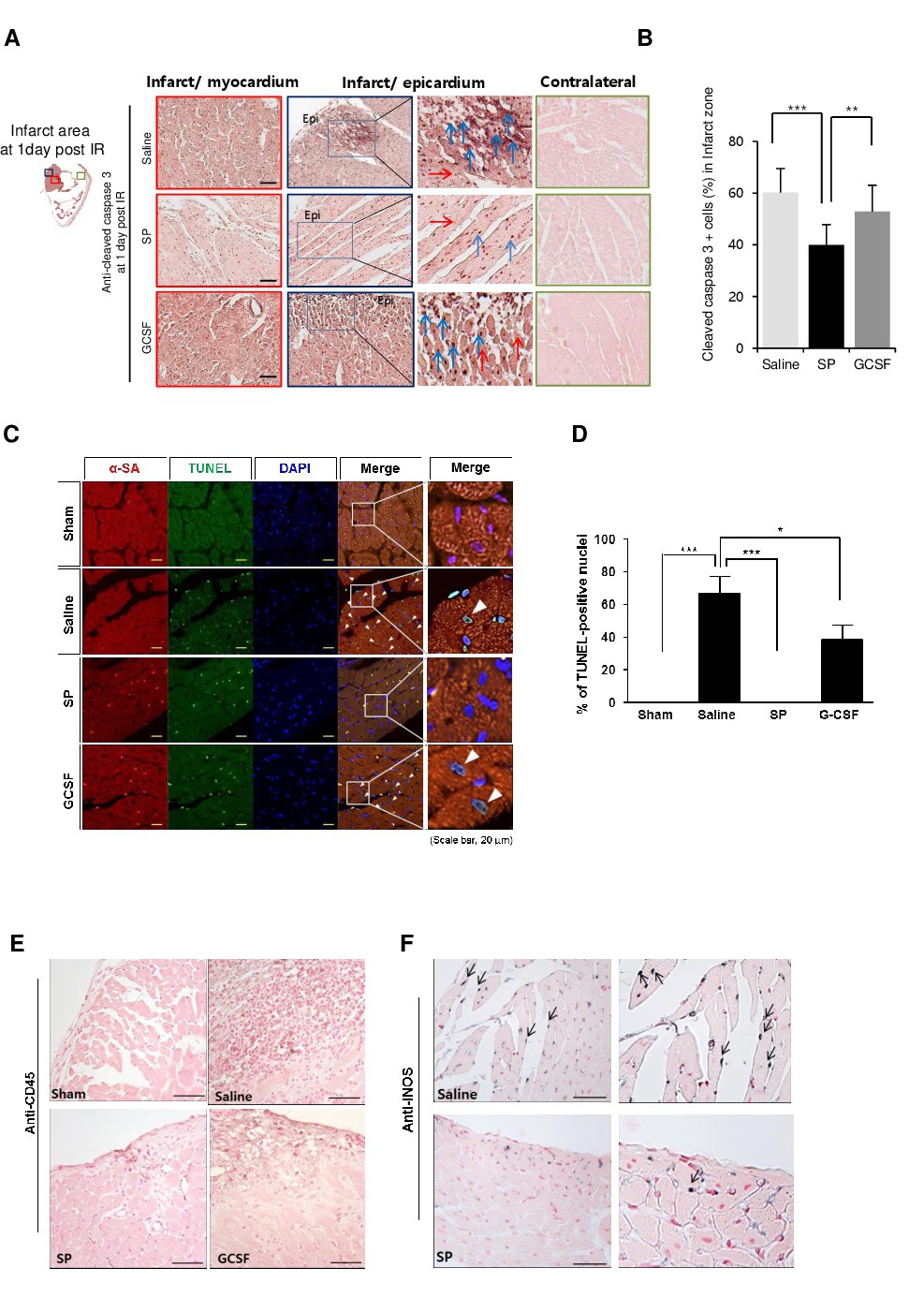 To determine the effects of SP on blood cells and systemic inflammatory responses during the early stages of IRI and cell death of cardiac tissue (which probably occurs before the effects of SP on stem cell mobilization), cytokines such as TNF-α and IL-10, circulatory M2 monocytes, and Tregs in the PB were analyzed at 4.5 h post-IRI (Fig. 3C–F). At 4.5 h post-injection, SP blunted the IRI-mediated TNF-α induction (Fig. 3C) but increased the levels of the anti-inflammatory cytokine IL-10 in the blood (Fig. 3D). Furthermore, SP markedly increased the numbers of CD11b+/CD206+ cells (Fig. 3E) and CD4+/Foxp3+ cells (Fig. 3F) in the blood. Cleaved-caspase 3 in the injured cardiac tissue was measured on day 1 post-IRI using immunohistochemical staining (Fig. 4). At day 1 after IRI, fewer apoptotic myocytes (positive for cleaved caspase-3 and TUNEL-positive; Fig. 4A-D) and fewer infiltrated leukocytes were detected in the SP-injected group compared with those in the saline- or GCSF- injected groups. Notably, more iNOS+ M1 macrophages of infiltrated leukocytes were present in saline-injected group than in SP-injected group (Fig. 4E and F).