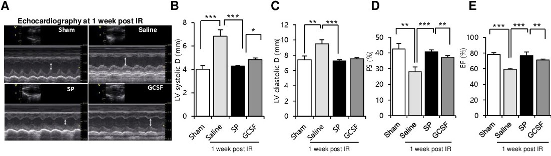 To investigate whether early treatment with SP or GCSF after IRI could affect the recovery of cardiac function, echocardiograms were performed at 1-week post-IRI (Fig. 5A–E and Table 2). The injection of SP after IRI resulted in higher left ventricular fractional shortening (FS) and left ventricular ejection fraction (EF) than that observed in the saline or GCSF-injected groups (EF: 59.3±4.79% [saline], 76.56±1.18% [SP], 71.11±1.52% [GCSF]; FS: 28±3.09% [saline], 40.7±1.27% [SP], 37.24±1.09% [GCSF]).