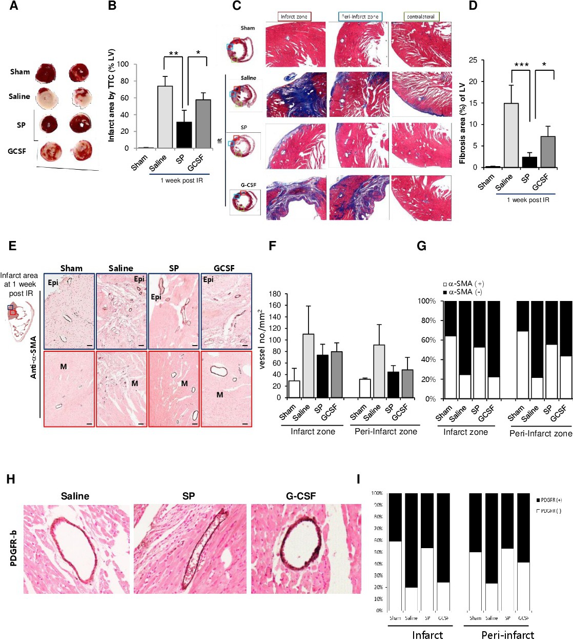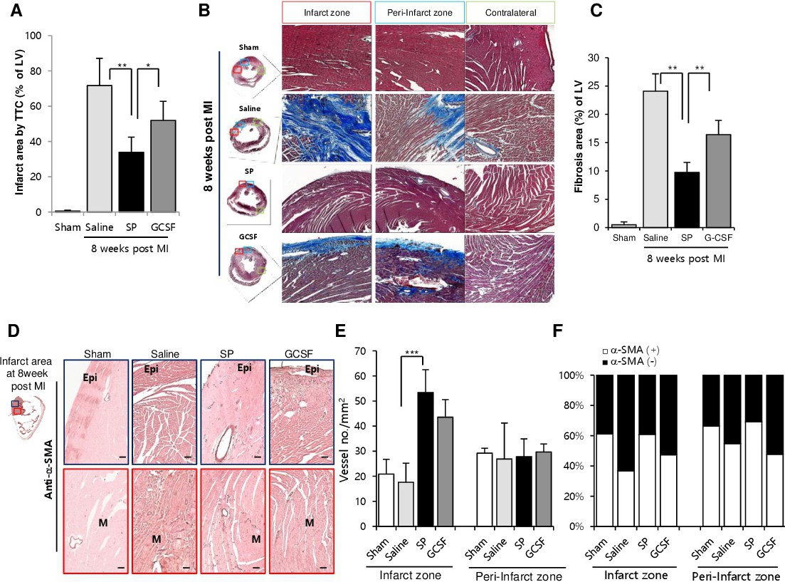 SP improved the recovery of cardiac function after IRI by reducing the infarction size and fibrosis, and by increasing revascularization with α-SMA-covered vessels; these effects were superior to those of GSCF