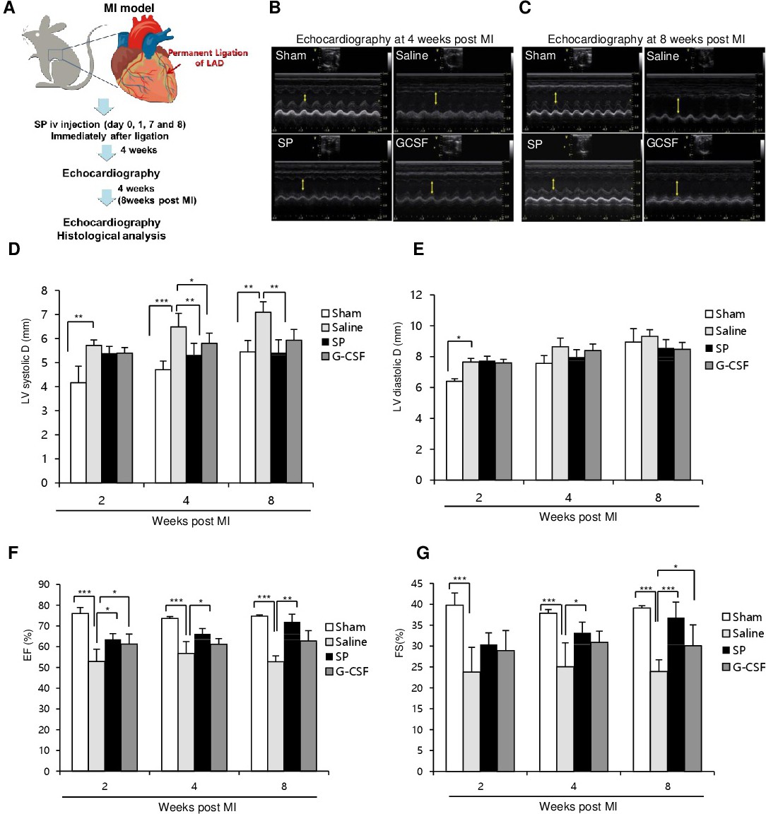 We further explored the efficacy of SP treatment on the recovery of cardiac function after permanent ligation in the LAD artery model, which requires more extensive tissue repair and neovascularization than the IRI model (Fig. 7). After permanent LAD ligation, SP or GCSF was injected twice a week for 2 weeks, and echocardiograms were performed at 4 and 8 weeks (Fig. 7A–G and Table 3). SP treatment also markedly improved the recovery of cardiac function in the permanent ligation model at 4 weeks (EF: 73.6±0.6% [sham], 56.7±2.9% [saline], 66.2±1.3%% [SP], 61.2±1.4% [GCSF]) and at 8 weeks (74.7±0.4% [sham], 52.8±1.4% [saline], 72±1.9% [SP], 62.8±2.5% [GCSF]). A clear difference was also observed in the %FS between the groups at 4 weeks (37.9±0.4% [sham], 25±1.3% [saline], 33.2±0.9% [SP], 30.9±1.3% [GCSF]) and at 8 weeks (39.1±0.5% [sham], 24.0±0.8% [saline], 36.8±1.5% [SP], 30.1±1.7% [GCSF]).